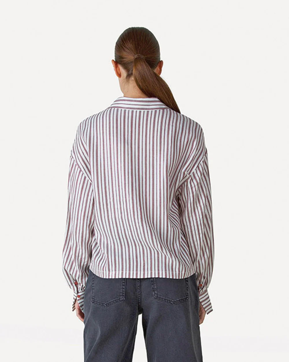 Het Thea Stripe Shirt is een frisse interpretatie van een tijdloze klassieker. Met een relaxte pasvorm met verlaagde schouders en geplooide manchetten biedt het een moeiteloos soepel silhouet. De dubbele knoopsluiting zorgt voor een subtiele, getailleerde touch, waardoor het perfect is voor zowel een nette als casual look. Combineer het met denim voor een relaxte look of stop het in een pantalon voor een meer verfijnde outfit.