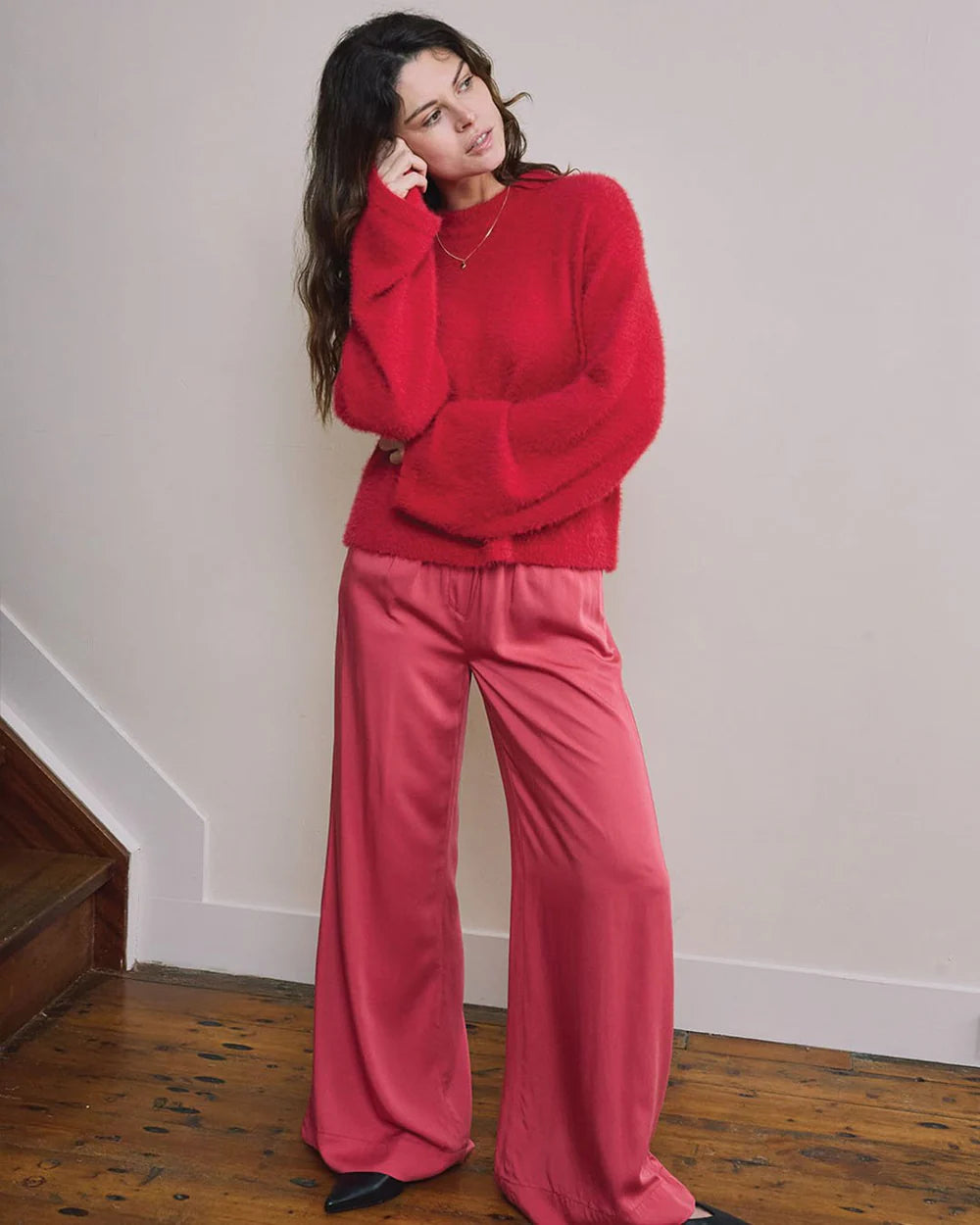 De Amaya gebreide trui staat voor zachtheid en gemak. Gemaakt van een comfortabele, harige breisel, heeft hij een losse pasvorm, wijde mouwen en verlaagde schouders voor een relaxed silhouet. Of je nu netjes gekleed gaat of casual, deze trui geeft elke look een zachte touch.