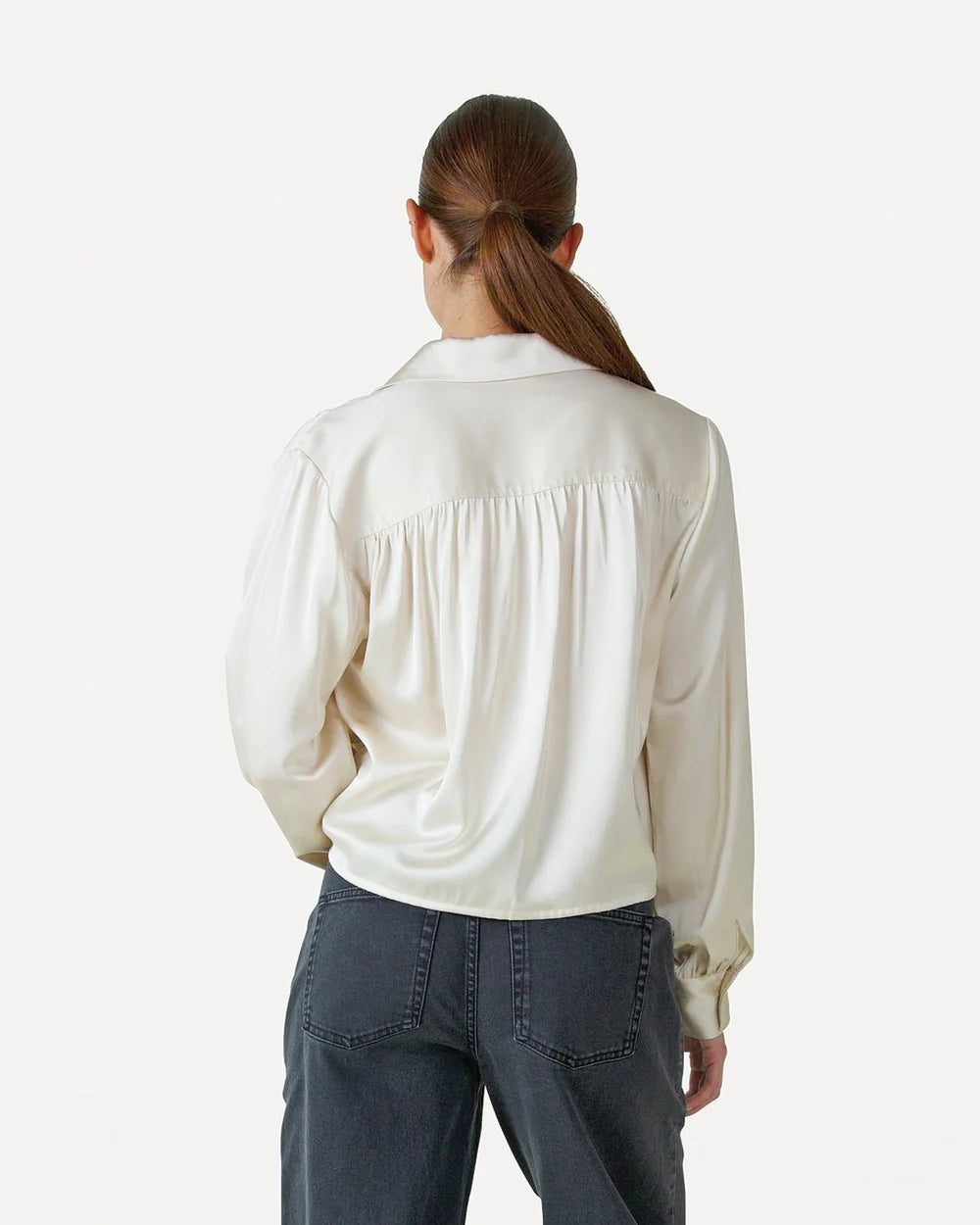 De Danai Top is een verfijnd kledingstuk met een moderne twist. Ontworpen met een elegante reverskraag en een flatterende overlappende pasvorm, heeft hij geplooide mouwen bij de manchetten en subtiele plooien aan de zoom voor extra vorm. Moeiteloos chic en veelzijdig, perfect voor zowel kantoordagen als avondactiviteiten. Maak de look compleet met een pantalon of denim voor een verzorgde maar toch relaxte outfit.