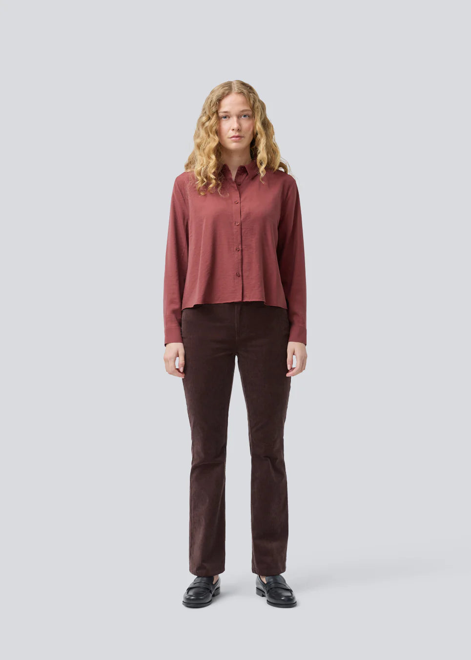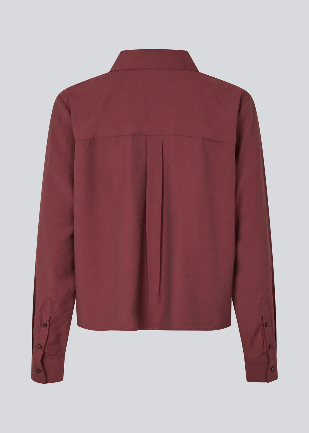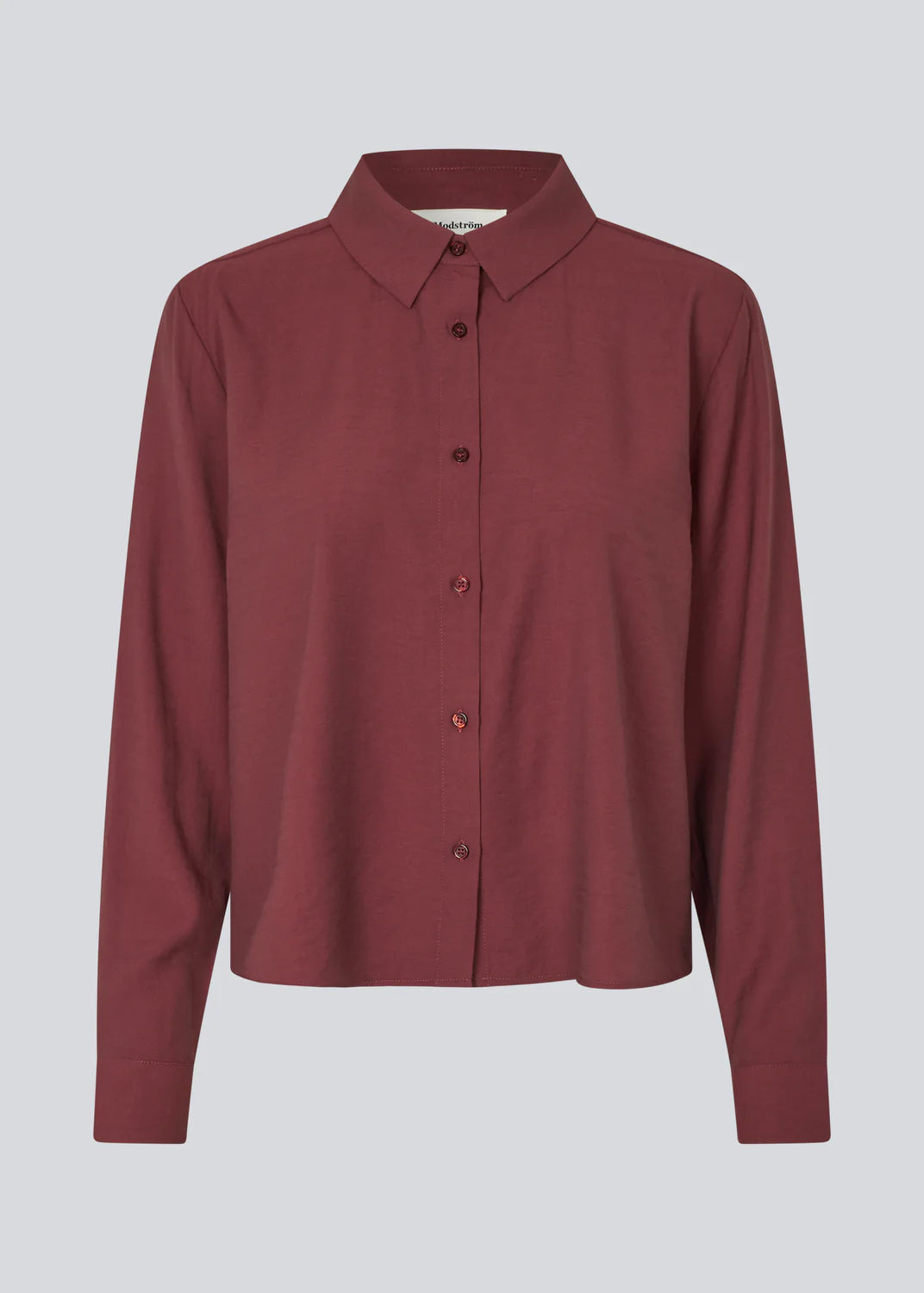 Rood overhemd in een lichte EcoVero viscose met een losse pasvorm. Het HudgesMD shirt heeft een kraag, een knoopsluiting aan de voorkant en lange mouwen met manchetten. Het model is 175 cm en draagt maat S/36.