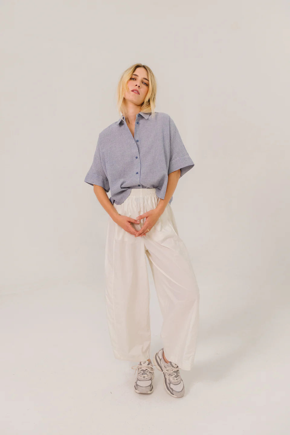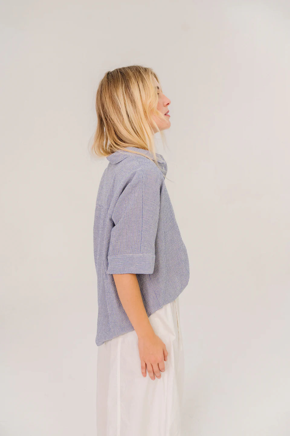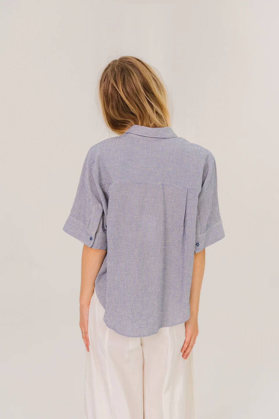 Kort mouwshirt met kimono-mouwen en afgeronde zoom. Losse, volumineuze snit, benadrukt door plooien aan de achterkant. Mouwen met knopen voor een nette afwerking