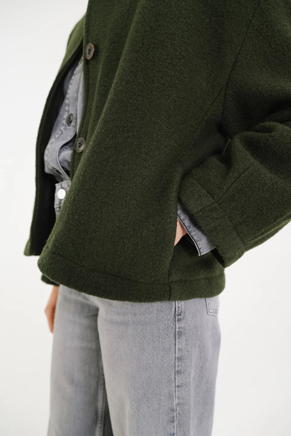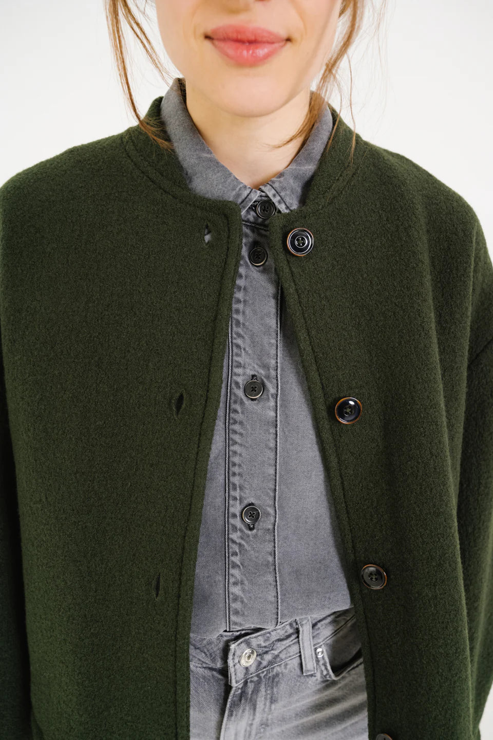 Ronde jas van donkere kaki gekookte wol, volledig gevoerd, met een herziene bomberstijl. De mouwen worden strakker gemaakt door brede plooien voor een gestructureerd en comfortabel silhouet. Met een bomberkraag, zichtbare knopen en discrete zakken in de naad combineert het warmte, moderniteit en elegantie.