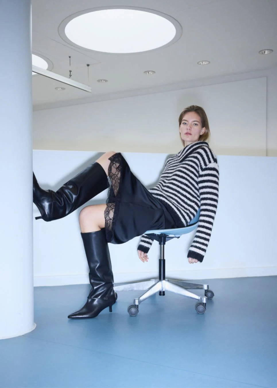 Zacht gebreid van gerecycled polyester. De Packermd coltrui heeft lange mouwen en een hoge halslijn met een zijsplit. Het model is 175 cm en draagt maat s/36.