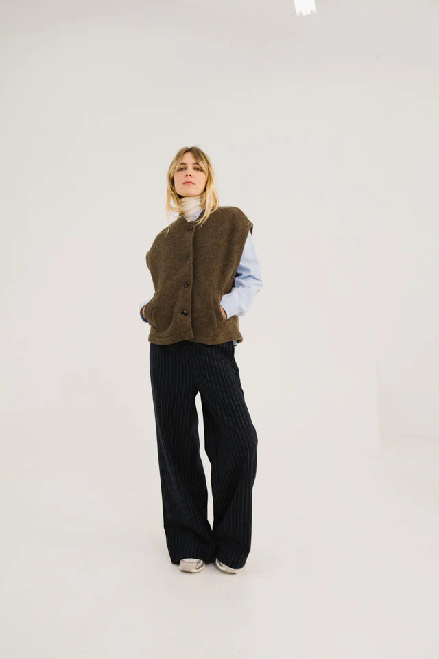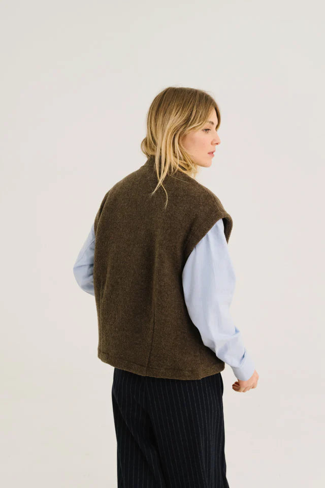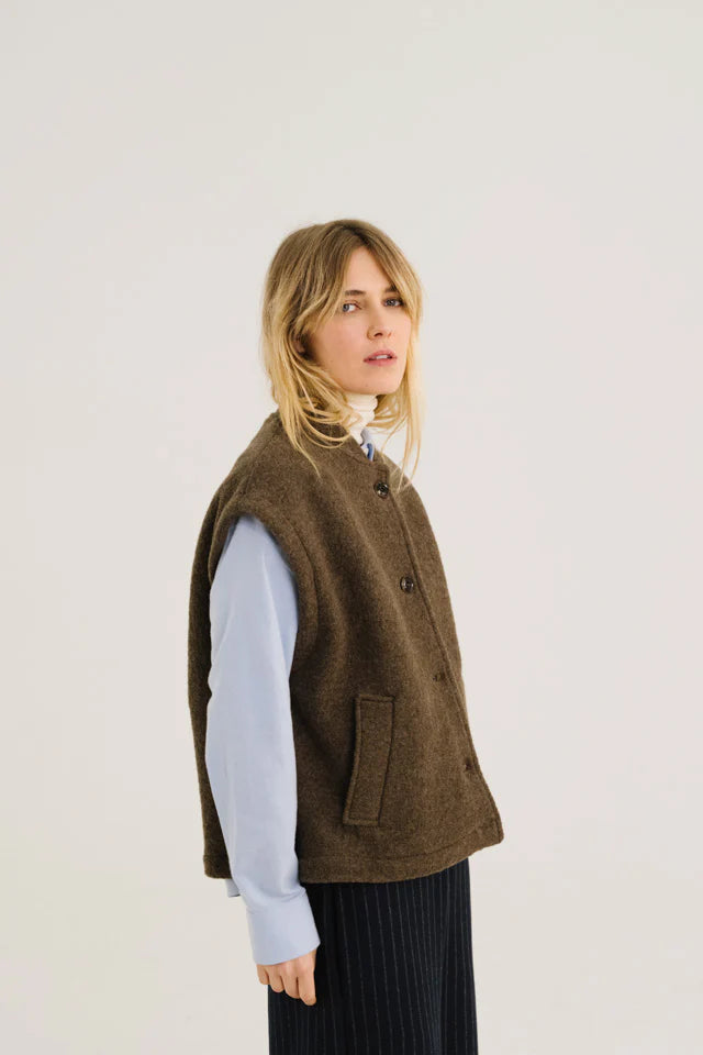 Ronde mouwloze jas van lichtbruine wol, ongevoerd voor een lichte en natuurlijke slijtage. De oversized snit wordt gestructureerd door figuurnaden aan de onderrug en versterkt door een kraag in bomberstijl. Met grote paspelzakken en zichtbare knopen combineert het volume, comfort en een eigentijdse look.
